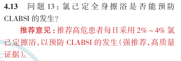 1、《血管內(nèi)導(dǎo)管相關(guān)性血流感染預(yù)防與診治指南(2025)》推薦:高?;颊呙咳詹捎?2%~4% 氯己定擦浴,以預(yù)防 CLABSI 的發(fā)生(強(qiáng)推薦,高質(zhì)量證據(jù))。