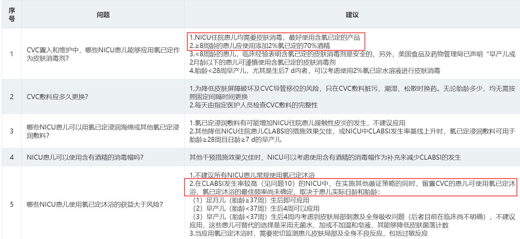 2、在《中心靜脈導(dǎo)管相關(guān)血流感染預(yù)防實踐》中,針對NICU患兒中心靜脈導(dǎo)管相關(guān)血流感染(CLABSI)的預(yù)防與控制,提供了專項臨床實踐指南。該指南譯自美國衛(wèi)生保健流行病學(xué)學(xué)會的新生兒重癥監(jiān)護(hù)病房意見書。指南建議,在NICU患兒進(jìn)行中心靜脈導(dǎo)管置入與維護(hù)時,應(yīng)優(yōu)先選用含氯己定的消毒產(chǎn)品。在CLABSI發(fā)生率較高的NICU中,足月兒(胎齡≥37周)生后、早產(chǎn)兒(胎齡<37周)生后4周即可使用氯已定沐浴預(yù)防感染。