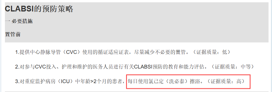 3.《SHEA/IDSA/APIC實踐建議:預(yù)防醫(yī)院感染策略綱要(2022年更新版)》提到,在重癥監(jiān)護(hù)病房(ICU)中年齡大于 2 個月的患者,應(yīng)每日進(jìn)行氯己定(洗必泰)擦浴,以降低中心靜脈導(dǎo)管相關(guān)血流感染(CLABSI)的發(fā)生風(fēng)險。(證據(jù)質(zhì)量:高)