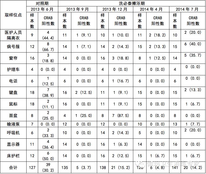 在進行洗必泰擦浴前的1個月以及干預期間大約每三個月,對ICU的CRAB進行了環(huán)境采樣培養(yǎng)。我們并未預先通知對CRAB進行環(huán)境取樣。環(huán)境取樣是由2位傳染病專家和2位感染控制護士實施,在每天早上進行環(huán)境清潔和洗必泰擦浴后的規(guī)定時間內(下午2點到4點)進行的。使用環(huán)境拭子采樣系統(tǒng)(3M Quick Swabs3M, St Paul, MA)對環(huán)境進行采樣。使用CHROMagar選取環(huán)境樣本中的CRAB。比較了對照期和洗必泰擦浴期的CRAB培養(yǎng)率。