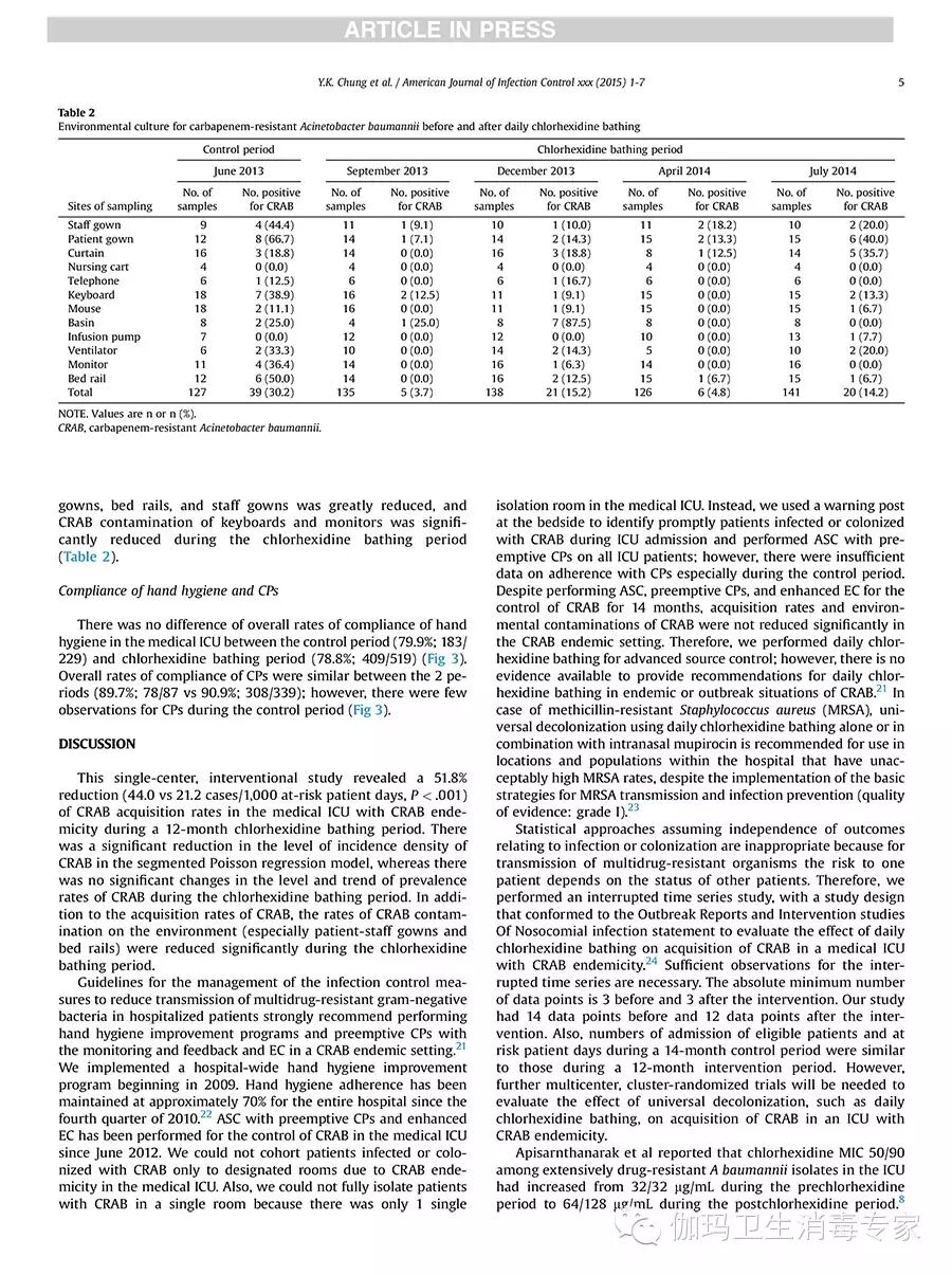 耐碳霉烯鮑曼不動桿菌(CRAB)是全球重要的醫(yī)院內病原菌。自2012年6月以來,我們在有CRAB流行的重癥監(jiān)護病房(ICU)實施了主動監(jiān)測培養(yǎng)(ASC)和接觸防護措施(CPs),并且采用改進環(huán)境清潔(EC),控制CRAB的流行。盡管這些感控措施實施了14個月,但是,CRAB的獲得率和環(huán)境污染率均未顯著降低。因此,我們考慮采用先進的源頭控制,譬如每日洗必泰擦浴等。研究人員報告,每日洗必泰擦浴可減少耐萬古霉素腸球菌耐甲氧西林金黃色葡萄球菌的獲得率。但是,沒有充分證據顯示每日洗必泰擦浴可降低流行性CRAB在醫(yī)院內的傳播。同時,一些非發(fā)酵革蘭氏陰性菌對洗必泰具有耐藥性。因此,我們調查了每日洗必泰擦浴是否能夠減少有CRAB流行的ICU里的CRAB的獲得率。