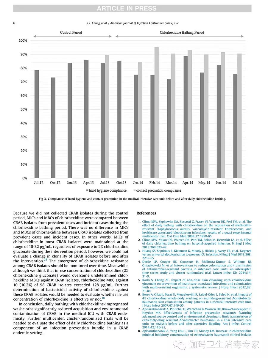 自2008年以來,由2位接受過培訓的感染控制護士每季度依據世界衛(wèi)生組織推薦標準評價了對手衛(wèi)生標準的全院范圍內的依從性。在洗必泰擦浴期以前的2013年7月初,2位感染控制護士也曾進行過一次對接觸隔離的依從性的監(jiān)督,在洗必泰擦浴期間自2014年1月每月進行了監(jiān)督。